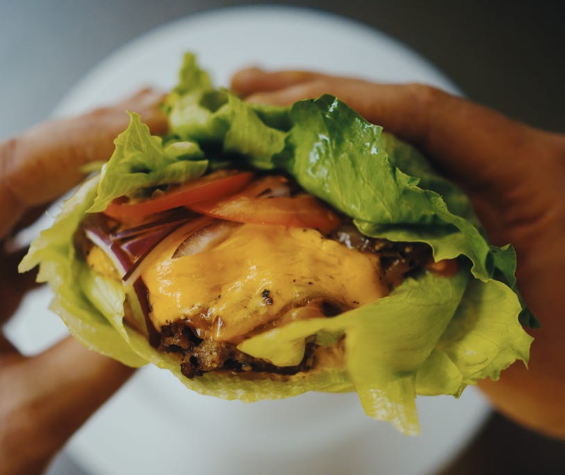Exact order language: "I'd like a bacon cheeseburger, bunless in a bowl, with lettuce, tomato, pickles, and mustard."