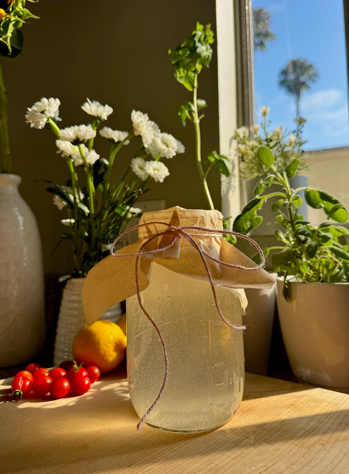 So I'll do a pinch of Celtic salt under my tongue followed by a large glass of water with lemon. Or I'll use about 1/4 teaspoon of sole water (shown above) - that's fully saturated salt water that I keep in a jar on my counter.